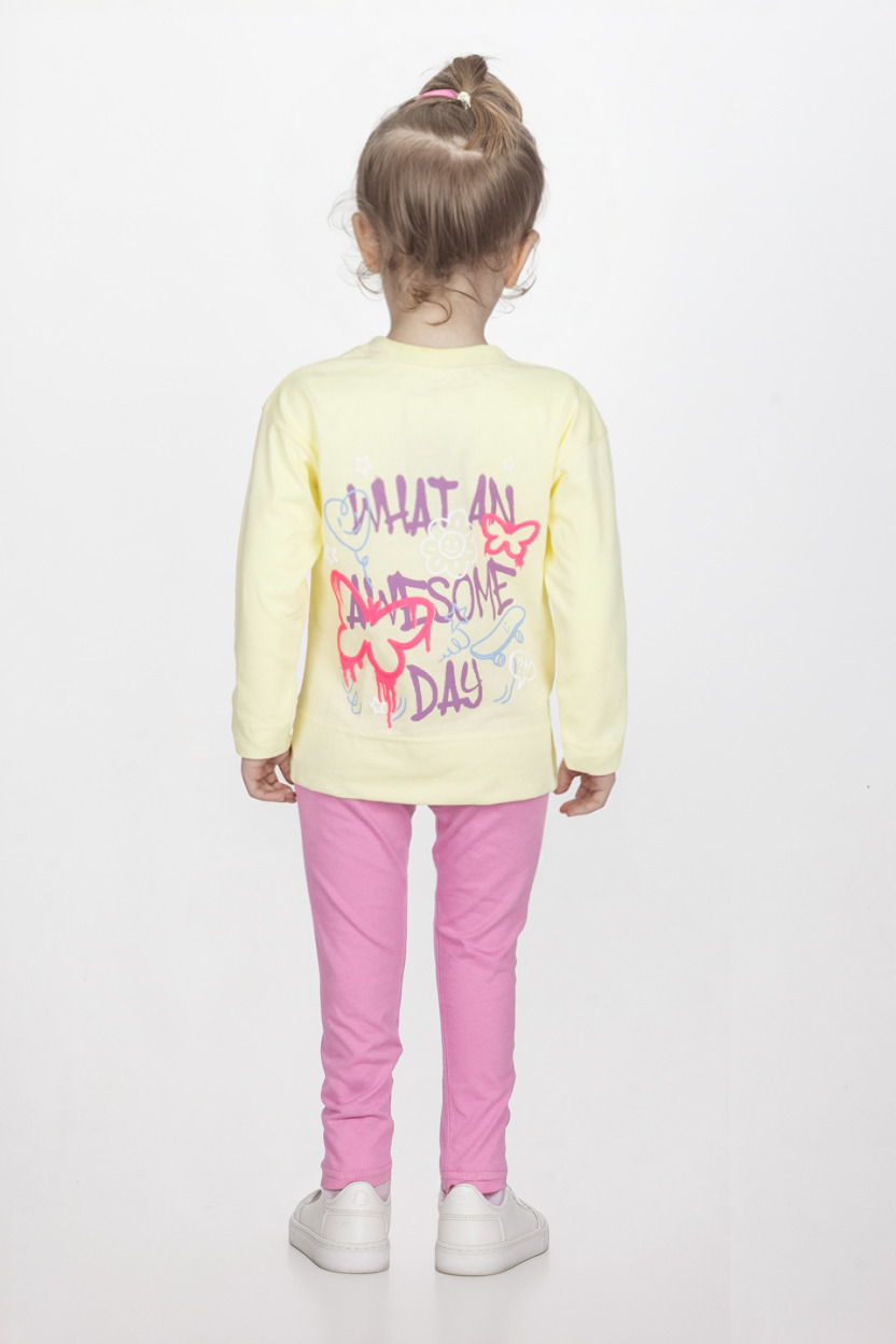 Παιδικό σετ Joyce, από μακό ύφασμα. Μπλούζα μονόχρωμη με τύπωμα στο στήθος και στο πίσω μέρος. Λαιμόκοψη. Μακρυμάνικη. Κολάν μακρύ, μονόχρωμο. Ελαστικό. Ελληνικής κατασκευής.